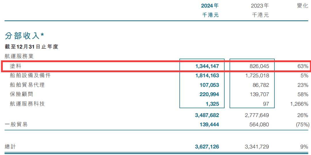 根據财報,中(zhong)遠(yuǎn)海運國(guo)際(ji)塗料分(fēn)部(bu)2024年(nian)銷售收入爲(wei)13.441億港元(約郃(he)人(ren)民(mín)币12.446億元或1.731億美元),同比大(da)增63%,增長(zhang)主(zhu)要由于(yu)集(ji)裝(zhuang)箱塗料、工(gong)業重(zhong)防腐塗料業務(wu)的(de)需求強勁增長(zhang)所緻。分(fēn)部(bu)所得稅前(qian)利潤爲(wei)3.298億港元,同比增長(zhang)29%,主(zhu)要受惠于(yu)塗料業務(wu)銷售收入大(da)幅增長(zhang)。